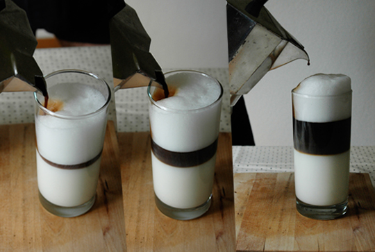 - Step 3. Make espresso using a three-cup stove top espresso maker. Once the espresso is made, make a small hole in the foam with spout and SLOWLY pour the espresso into the milk. When pouring espresso, do it about 1/2cm away from the side edge of the glass. The foam will rise and you will see a layer of espresso between the foam and the milk start to form. If the milk starts to swirl, than you are pouring the espresso too quickly... and that's it!