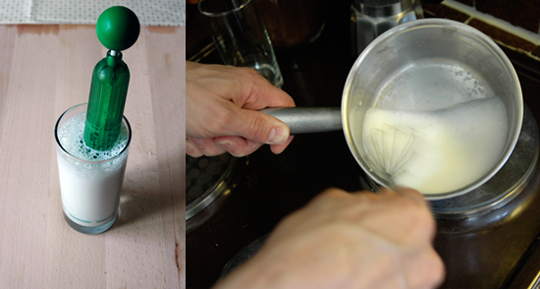 If you have a milk foaming device (ikea makes a good one), then foam warmed milk directly in the glass. Leave approx 2.5cm of space at the top of the glass.