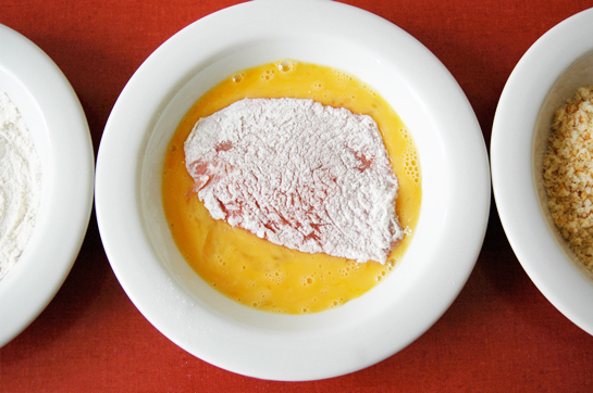 - 4. Dip veal on both sides into flour first, then egg and lastly bread crumbs.